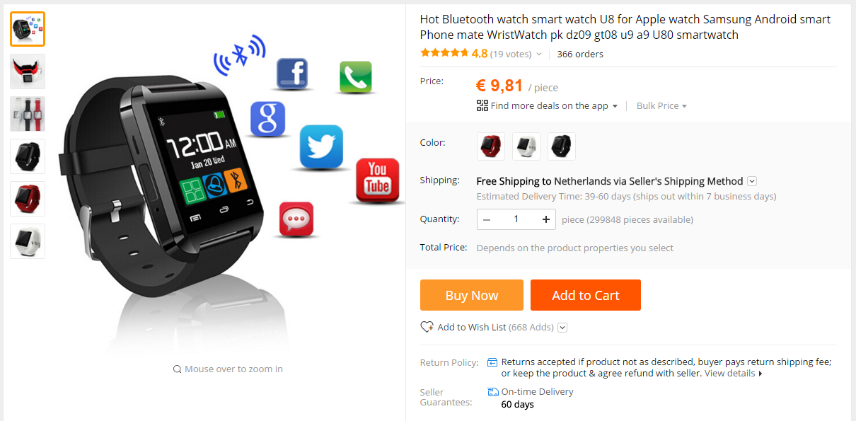 Oké, we weten hoeveel we hebben uitgegeven, hoeveel procent dit is van alle Nederlandse online aankopen en we weten hoe veel meer dit was dan het jaar ervoor. De 31% zet de cijfers in een goed perspectief. Om dit percentage concreet te kunnen maken, pakken we nog wat cijfers erbij van een survey die door PostNord is afgenomen: 73% van alle Nederlanders deed in 2015 een aankoop in een online webshop. Gemiddeld wordt er €357,- per persoon per jaar uitgegeven. De snelle rekenaar onder ons ziet dat 3% van €357,- uiteindelijk €10,71 is en dit is dus het bedrag dat Nederland gemiddeld uitgaf per persoon in 2015. Laten we eens even kijken wat de gemiddelde uitgave per Nederlander hiervan heeft kunnen kopen. Dit kan de meest goedkope smart watch zijn geweest die op dit moment verkrijgbaar is. Als u deze graag gerecenseerd ziet, kunt u onderaan de pagina een reactie achterlaten.